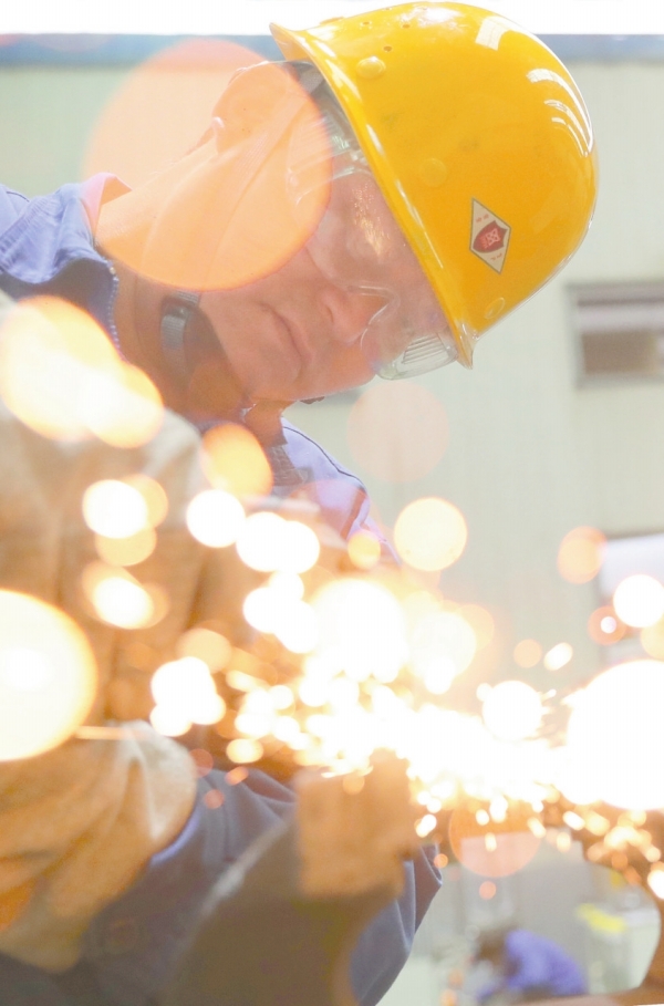 2月18日,衡东县湖南机油泵股份有限公司,员工在进行打磨作业。该公司员工当天全员到岗,满负荷生产。