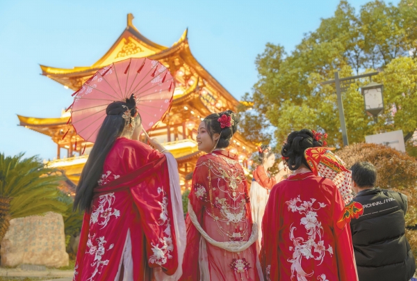 2月18日,长沙市天心区,游客穿着各类服饰在杜甫江阁旅拍。近年,随着旅拍热的持续“出圈”,杜甫江阁作为湖南最大的仿唐木质结构建筑,吸引了众多游客前来游玩,也成为旅拍爱好者青睐的取景基地。湖南日报全媒体记者 辜鹏博 摄