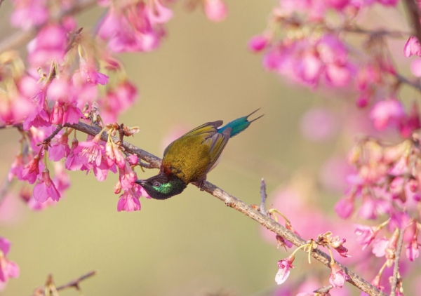 2月18日,湖南省森林植物园,钟花樱竞相绽放,叉尾太阳鸟闻香而至,饱食花蜜。 湖南日报全媒体记者 张京明 摄