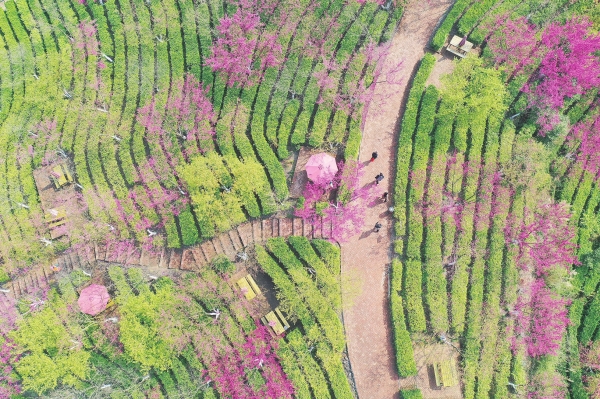 2月17日,郴州市苏仙区高椅岭村,游客在樱花茶园里游玩。早春时节,该茶园的樱花陆续绽放,满园春色吸引了不少游客前来踏青赏花。