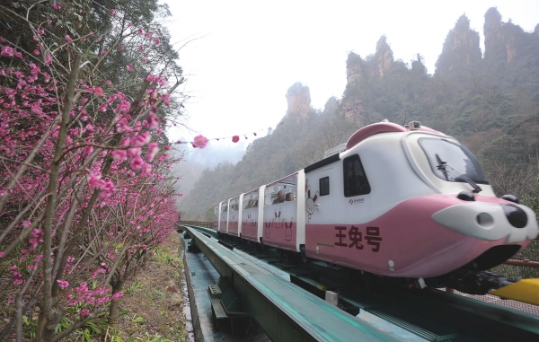 2月19日,游人乘观光电车在十里画廊游览。近日,张家界国家森林公园梅花绽放,春意盎然,游人徜徉在花海之中,好不惬意。 吴勇兵 摄(湖南图片库)