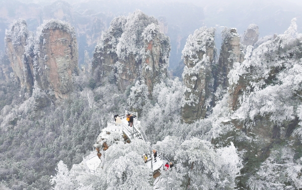 2月22日,游客在张家界国家森林公园黄石寨赏雪游玩。当地近日迎来低温雨雪天气,黄石寨变身“冰雪世界”,峰林银装素裹,吸引各地游客前来体验新春“冰雪游”。