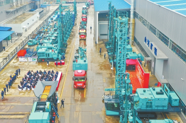 2月27日,装载着10余台凿岩设备的车队驶出山河工业城。当天,湖南山河矿岩装备有限责任公司揭牌庆典暨新春批量发货仪式在山河工业城举行。这批产品主要发往我国新疆、安徽等省份,以及南非等国家。