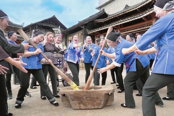 3月6日,通道侗族自治县双江镇竹坪侗寨,侗族妇女欢聚一堂,举行锤侗布、织侗锦、炸油茶等民俗活动,喜迎“三八”妇女节。图为打糍粑比赛现场。杨芝干 摄(湖南图片库)