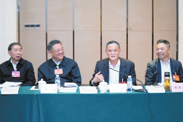 3月6日下午,住湘全国政协委员袁爱平(右二)在小组会议上发言。