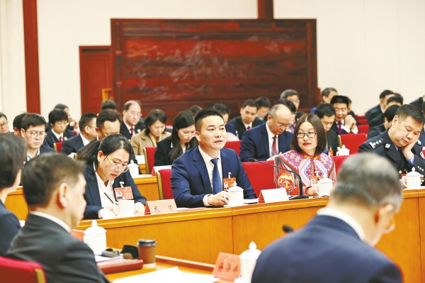 3月10日上午,周超代表(中)在湖南代表团第五次全体会议上发言。