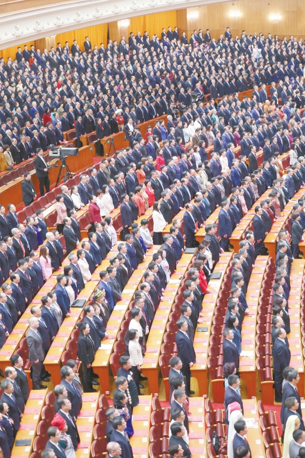雄壮的进行曲响起,在全场如潮的掌声中,习近平等党和国家领导人走上主席台。下午3时,闭幕会开始。