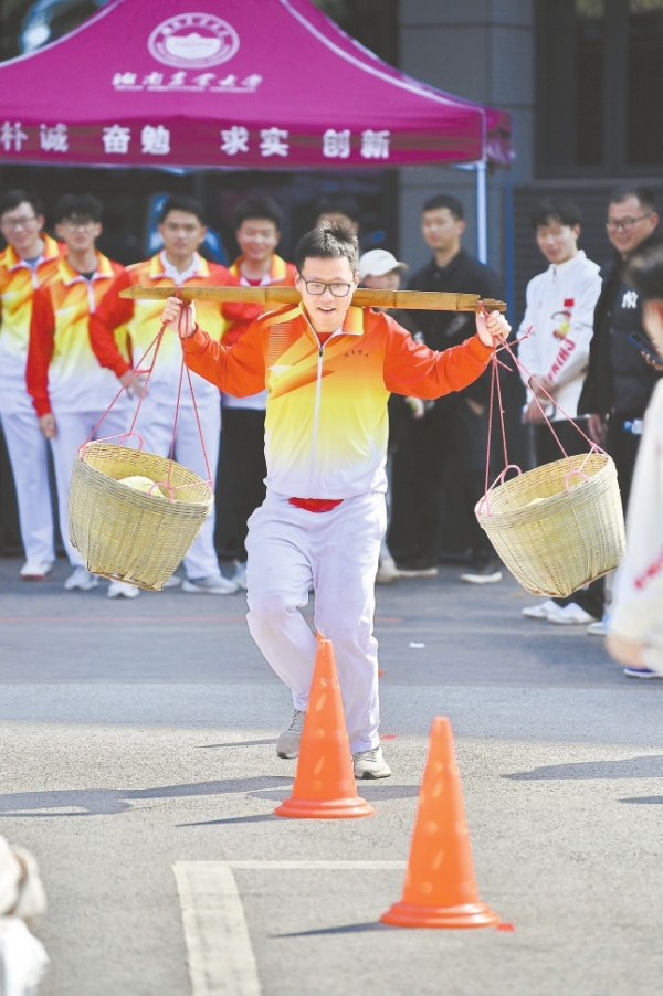湖南农业大学,大学生在参加趣味农耕比赛。