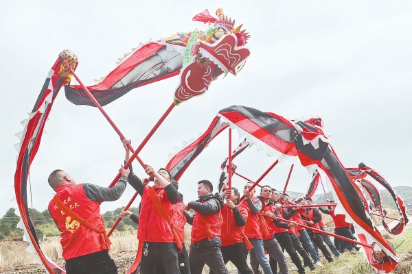 临武县花塘乡古龙湾村,村民舞起双龙,跳起“大头罗汉”舞,祈福国泰民安。