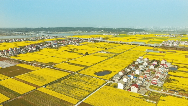 3月19日,桃源县木塘垸镇万亩油菜花竞相绽放,与蓝天白云交相辉映,构成一幅迷人的乡村田园画卷。童险峰 摄(湖南图片库)