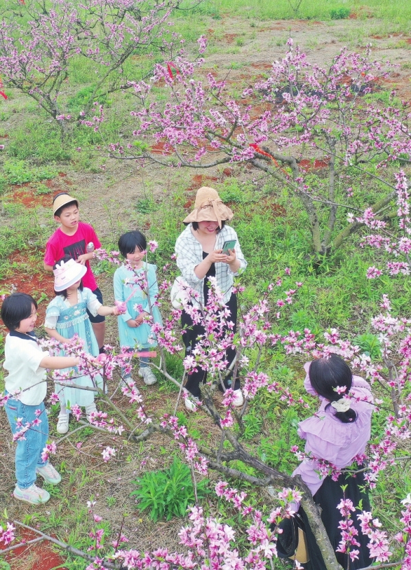 3月31日,游人在赏花游玩。近日,嘉禾县三汇农场200多亩桃园里的桃花竞相绽放,吸引许多游客前来踏青赏花。 黄春涛 刘井芳 摄影报道(湖南图片库)