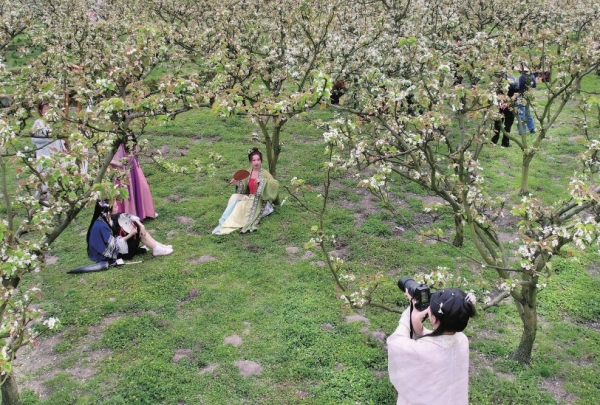3月30日,洪江市大崇乡石板桥村,2500亩金秋梨花开正盛,吸引众多游客前来拍照打卡。