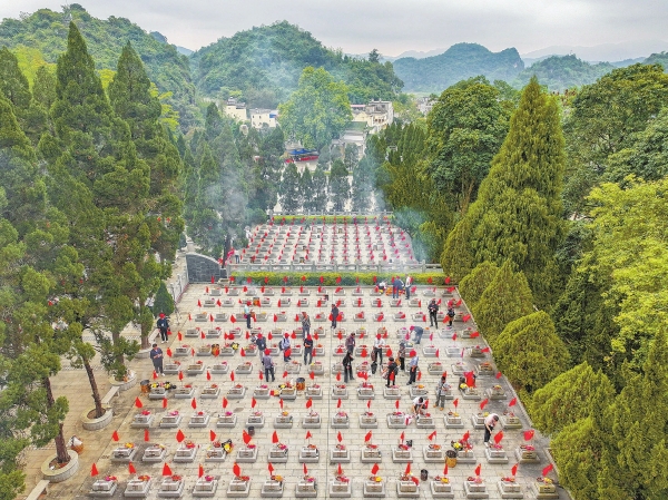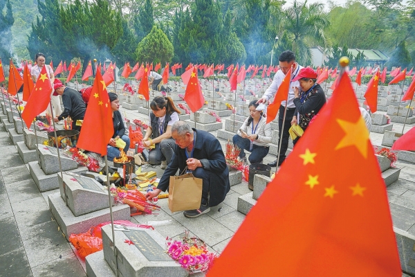3月29日,广西壮族自治区凭祥市匠止烈士陵园,青山环抱,松柏掩映。在一座座墓碑后面,鲜艳的五星红旗迎风招展,写下永远的铭记和缅怀。