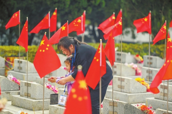 3月29日,广西壮族自治区凭祥市匠止烈士陵园,烈士亲属蔡红英带着不满4岁的女儿周瑾瑜进行祭扫。