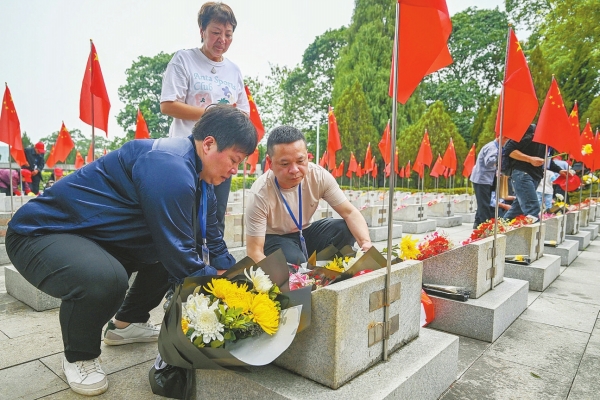 3月29日,烈士亲属们用鲜花祭奠英烈。