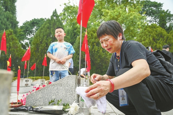 3月29日,烈士亲属含泪擦拭烈士墓碑。