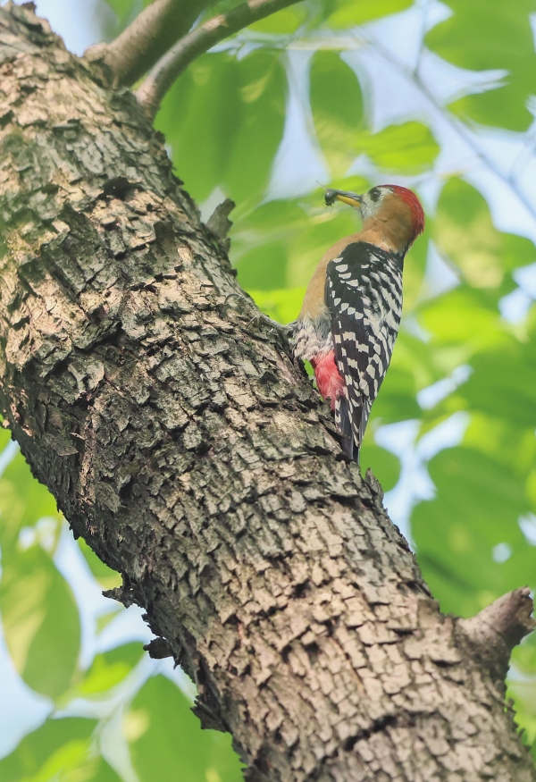 4月12日,棕腹啄木鸟在树上叼出昆虫。它被称为“森林医生”,列入《国家保护的有益的或者有重要经济、科学研究价值的陆生野生动物名录》。
