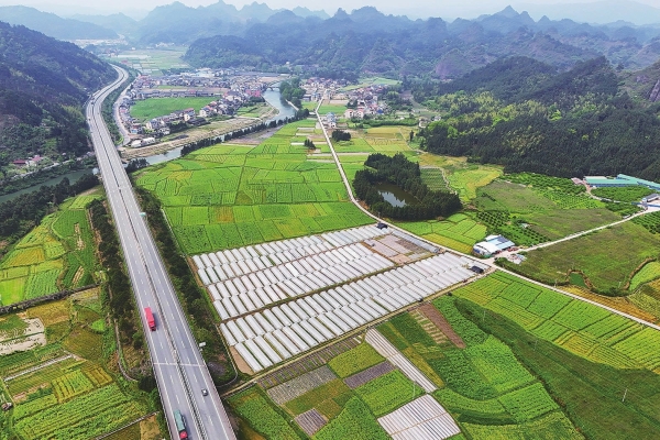 4月14日,通道侗族自治县万佛山镇下乡村,包茂高速与田园、民居、河流、青山交相辉映,景美如画。