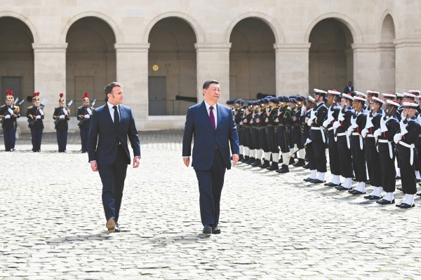 习近平和夫人彭丽媛乘车抵达时,马克龙和夫人布丽吉特在下车处热情迎接。在雄壮的进行曲中,两国元首步入广场。军乐团奏中法两国国歌。两国元首检阅法兰西共和国卫队和陆海空三军仪仗队,并观看分列式。随后,习近平和彭丽媛同法方主要官员一一握手致意。马克龙夫妇同中方陪同人员分别握手致意。