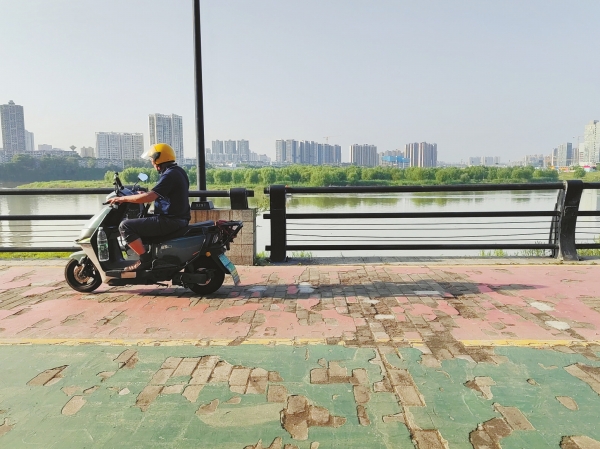 5月12日晚,在位于芙蓉区的浏阳河南岸绿道,记者发现有些路段出现了连片破损,坑坑洼洼,有噪声、震动声音较大的摩托车在绿道上疾驰而行,还有人牵着未带嘴套的大型犬遛弯。湘江西岸绿道沿江滩铺设,需要经防洪堤下一段台阶才能到达。5月13日晚,记者从牌楼口沿湘江西岸防洪堤行走了1千米也没有找到可以直接到达绿道的无障碍通道,记者看到有骑行人扛着单车下台阶。
