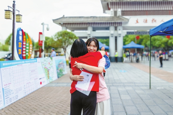 6月7日,永州市第三中学考点,一名老师拥抱学生,为其加油。田泽祥 摄(湖南图片库)