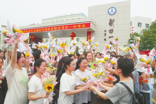 寓意“一举夺魁”的向日葵,祝贺“高考结束,奔赴下一场山海”的横幅,祝愿鱼跃龙门、旗开得胜的十米高“水门”……今年的高考,仪式感满满,考生们越发自信从容。