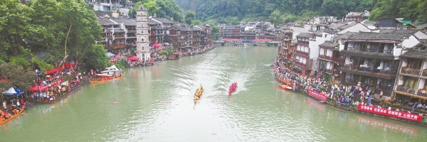 与此同时,各大景区、文化场馆将端午习俗、非遗民俗相融合,纷纷推出“文旅大餐”。在岳阳,屈子文化园开展水祭大典;在张家界,天门山景区举办非遗展演;在湘西,人们走进自治州博物馆,体验苗绣技艺,近距离感受非遗魅力……