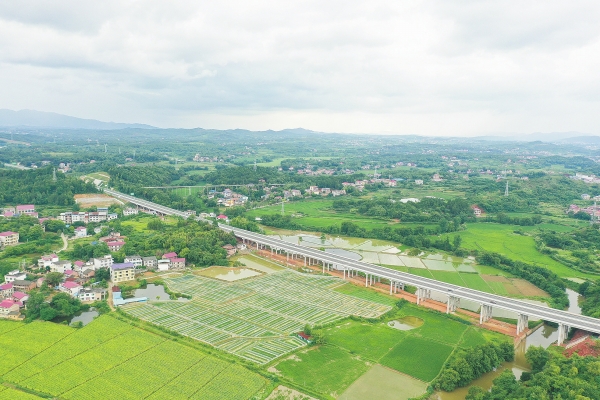 6月11日,祁东县双桥镇江南新村,穿境而过的衡(阳)永(州)高速公路与青山、农田、村庄相互映衬成景,美不胜收。
