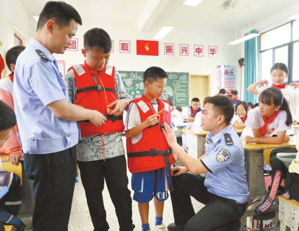 6月13日,保靖县毛沟小学,民警为学生讲解防溺水安全知识。天气逐渐炎热,该县公安局组织民警深入中小学开展以“珍爱生命 预防溺水”为主题的安全教育活动,通过传授防溺水安全急救技能、实例警示教育、现场模拟急救等方式,提高学生的安全意识和自救自护能力。