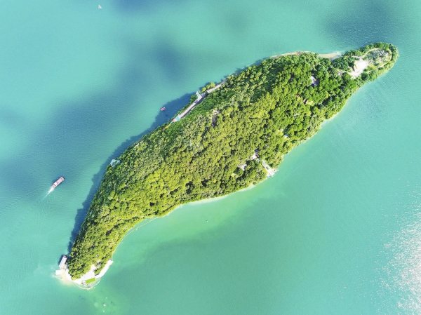 6月22日,游客乘船在资兴市东江湖五岛一村凤凰岛景区游玩赏湖。入夏以来,资兴市东江湖旅游渐入高峰。此地湖光山色、蓝天白云交相辉映,吸引游客纷至沓来。