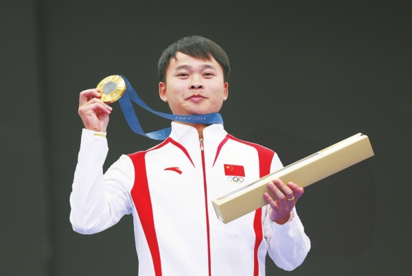 7月28日,在法国沙托鲁举行的巴黎奥运会射击男子10米气手枪决赛中,中国选手谢瑜夺冠。图为谢瑜在颁奖仪式上。新华社 发