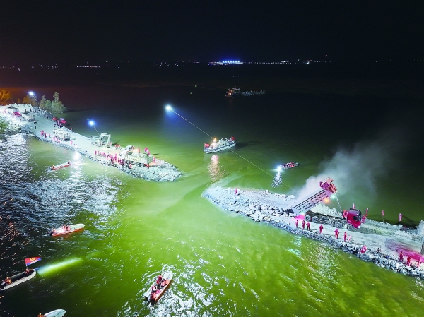 通宵达旦,洞庭湖堤坝上架起“光明防线”。团洲垸洞庭湖一线堤防发生决口后,国网湖南电力迅速集结骨干人员、装备赶赴一线,以最快速度在大堤两岸架设一道光明防线,为大堤合龙提供了电力保障。7月6日深夜,团洲垸沿线18公里长的应急照明彻夜通明,120多名电力员工逐基巡视,为巡堤除险彻夜守护。