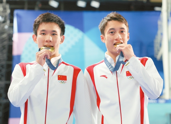 7月29日,冠军中国选手练俊杰(右)/杨昊在颁奖仪式上。当日,在巴黎奥运会跳水男子双人十米台决赛中,练俊杰/杨昊夺得金牌。