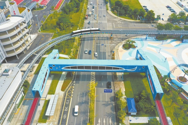8月16日,湖南湘江新区潭州大道大王山云巴站段,一辆云巴列车从新修的海蓝色人行景观桥边驶过。该景观桥全长61米,横跨潭州大道,连接了大王山社会停车场和湘江欢乐海洋,方便游客通行。