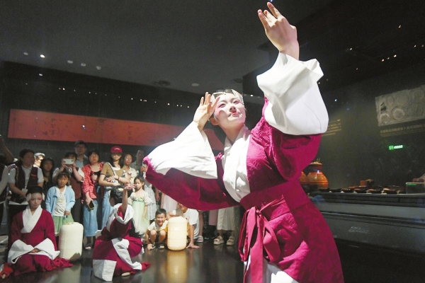 8月18日晚,湖南博物院,演员身穿汉服在“长沙马王堆汉墓陈列”展厅表演快闪。今年是马王堆汉墓考古发掘50周年,该院举办了“博物馆之夜”专场活动。通过丰富的解读方式,促进了汉文化的传承与创新,增强了公众对汉文化的认知与兴趣。