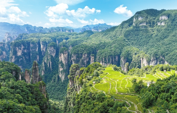 8月19日,张家界国家森林公园天子山景区,连绵耸立的峰林与悬崖峭壁之上的农田交相辉映,宛如一幅美丽的田园生态画卷在蓝天白云下徐徐展开。