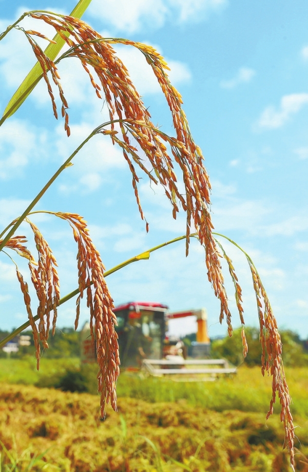 8月22日,祁东县灵官镇,村民驾驶农机收割稻谷。曹正平 曾炜煜 摄影报道(湖南图片库)
