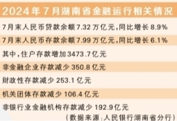 日前,人民银行湖南省分行发布的2024年7月湖南省金融运行情况显示,前7个月人民币存款增加2556.4亿元,其中住户存款增加3473.7亿元,非金融企业存款减少350.8亿元,非银行业金融机构存款减少192.9亿元。