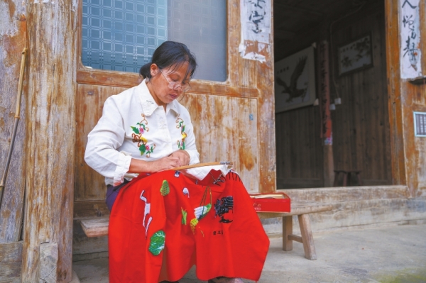 绥宁县关峡苗族乡大园村,村民在家门口制作苗族插绣。湖南日报全媒体记者 曾冠霖 摄 |
