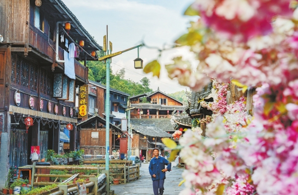 通道侗族自治县双江镇芋头村,村民行走在古色古香的侗寨里。湖南日报全媒体记者 李健 摄 |