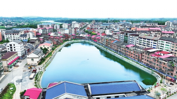 初秋时节,漫步在衡南县茶市镇浴塘,周边房屋依水而建,一池清水倒映着蓝天白云,人们在塘边步道散步闲聊,一幅安静祥和的美丽城镇宜居图景跃然眼前。