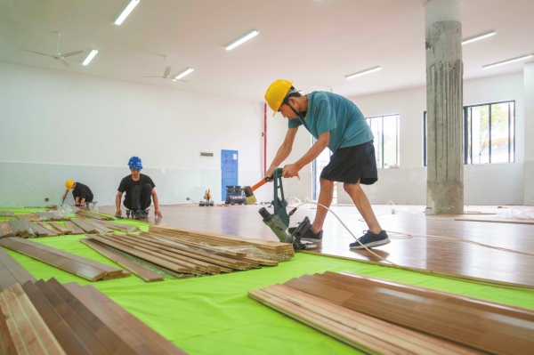 8月29日,平江县杨梓山学校,工人给舞蹈教室安装地板。湖南日报全媒体记者 辜鹏博 摄