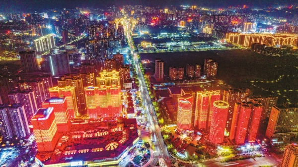 9月10日晚,怀化市鹤城区大街小巷张灯结彩,高楼大厦灯光璀璨,盛装迎接第十一届全球湘商大会的召开。