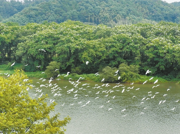 9月16日,新宁县夫夷江国家湿地公园,成群鹭鸟在此觅食、飞翔,蔚为壮观。朱巨滨 摄(湖南图片库)