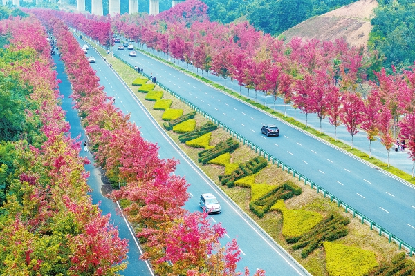 10月13日,益阳市赫山区鱼形湖东路,枫叶渐红,吸引不少市民、游客前来打卡拍照。肖克 摄(湖南图片库)