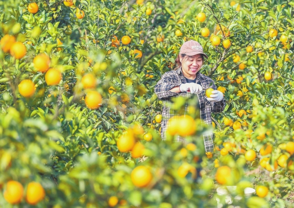 11月3日,道县东门街道新立村,果农在采收脐橙。近日,该县21.7万亩脐橙进入成熟期,果农抓紧采收供应市场。近年来,道县引导农民通过“党支部 基地 农户”模式,规模化、标准化、品牌化发展脐橙种植,推动脐橙产业成为村民增收致富的绿色产业。蒋克青 摄(湖南图片库)