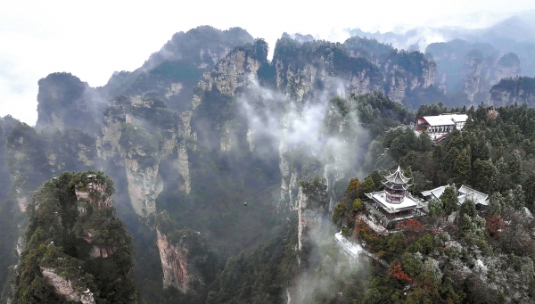 12月11日,张家界国家森林公园迎来今冬首场降雪。在黄石寨景区,云雾、雾凇、冰挂同现,点缀在峰林沟壑间,美不胜收。