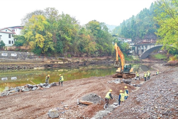 12月10日,吉首市河溪镇张排村河道综合治理施工现场,工人正在忙碌作业。该村地处峒河与万溶江交汇处。今年,当地加大河流综合治理力度,通过疏浚河道、绿化岸坡等措施,畅通河流水系、提升防洪能力、改善人居环境。