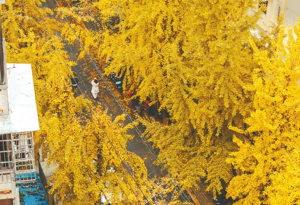 12月11日,长沙市开福区国庆新村,银杏树换上“金装”,迎来最佳观赏期,游客们在此拍照打卡,仿佛置身童话森林。