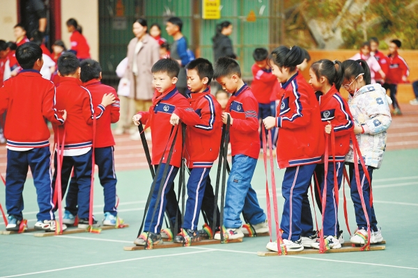 歌乐山顶的绿茵场上,重庆市沙坪坝区山洞小学的足球小将们进行着激烈的接力比拼;冬季冰雪运动如火如荼,沈阳市浑南区第九小学的同学们在校内陆地冰球训练场加紧练习;广西玉林市民族中学的体育课上,传统民族体育项目陀螺、高脚竞速等比赛依次展开……